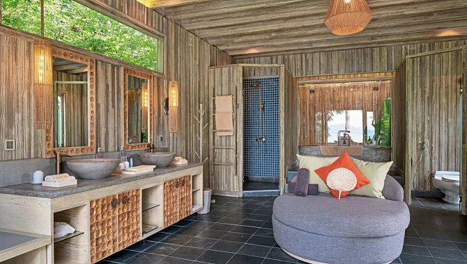 91-100 qm, Villa, Strandlage, Meerblick, Sitzecke, Schreibtisch, Doppelbett (Kingsize), Sofabett, Badewanne, Regendusche, Bademantel, Haartrockner, Klimaanlage, Minibar kostenpflichtig, Safe, TV, Espressomaschine, Kaffee/Tee, Kühlschrank, Terrasse (möbliert), direkter Strandzugang, Privatpool