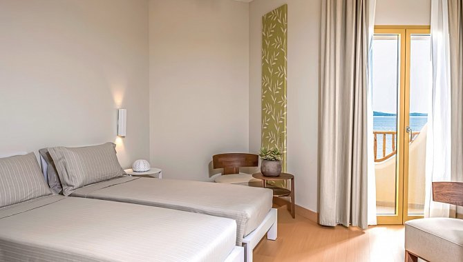 Meerblick-Zimmer (DUM/EUM): 16-20 qm, Meerblick, Dusche, Haartrockner, Klimaanlage, Minibar, Safe, 1 TV (Sat-TV), Telefon, Balkon oder Terrasse