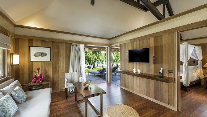 Zimmerausstattung: 114 einzigartige Villen und Suiten teilweise mit privatem Infinity-Pool. Bad, Föhn, Bademantel, TV, WLAN (ohne Gebühr), Tee-/Kaffeezubereiter, Minibar, Safe, Bluetooth-Soundsystem, 24 Stunden Zimmerservice und Klimaanlage