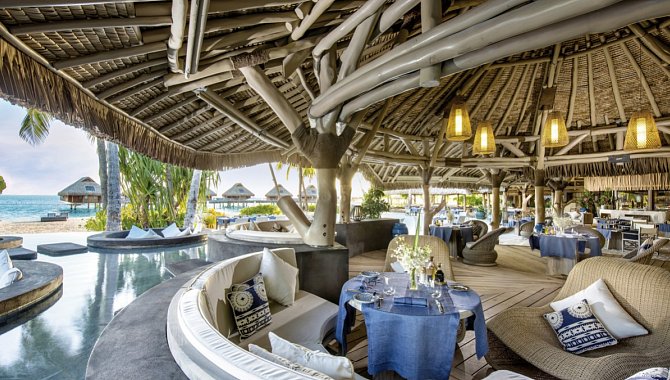 - Iriati Restaurant und Weinbar: Open-Air-Restaurant auf Sandboden, Blick auf die Lagune, klassische französische Küche