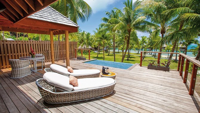 Overwater Villa: ca. 116 qm, mit geräumiger Terrasse und direktem Zugang zur Lagune; auch mit uneingeschränktem Blick auf die Lagune buchbar ( Deluxe Overwarter Villa)