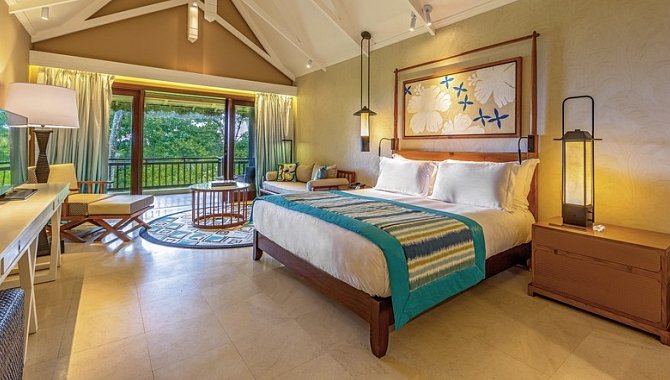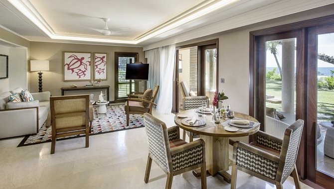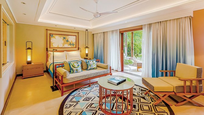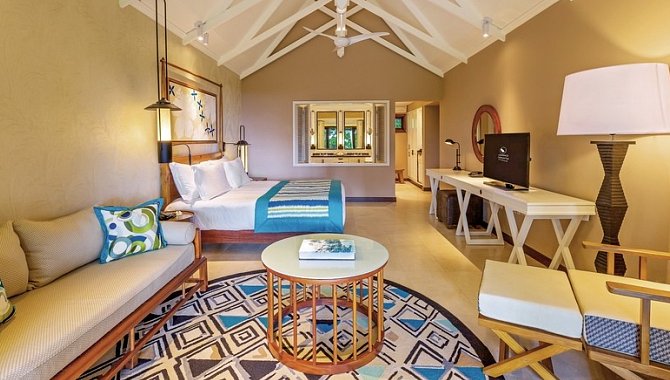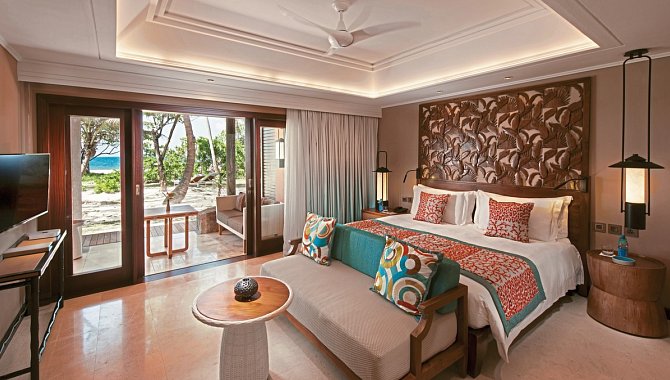 Die 96 Suiten in 2-stöckigen Gebäuden und 8 ebenerdige Pool Villen befinden sich entlang zweier Strände inmitten tropischen Grüns, wenige Meter vom Strand entfernt. Mit Bad, Badewanne, sep. Dusche, Föhn, Bademantel, Satelliten-TV (Flachbildschirm), Telefon, Apple Mac Mini Entertainmentsystem inkl. iPod-Verbindung, WLAN, Ventilator, Klimaanlage, Minibar, Kaffee-/Teezubereiter, Nespresso-Maschine, Safe, Balkon oder Terrasse. Meerseite.