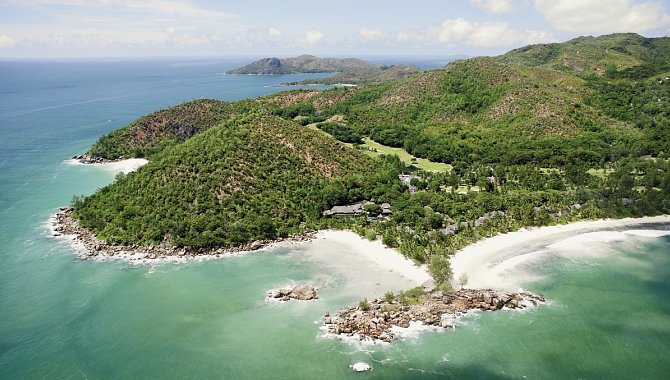 - Das Hauptgebäude thront auf den Hügeln inmitten grüner Natur und überblickt die Strände der Anse Kerlan