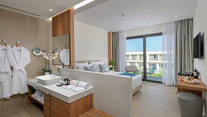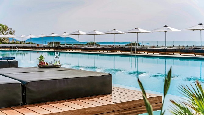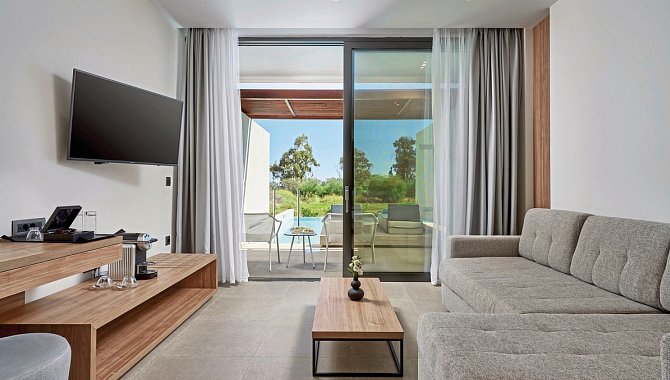 Juniorsuite Meerblick Privatpool: 36-40 qm, Juniorsuite, Meerblick, 1 Bad, Dusche, WC, Bademantel, Badeslipper, Haartrockner, Kosmetikspiegel, Klimaanlage, individuell regulierbar, Safe, 1 TV (Sat-TV, Flachbildschirm), Telefon, WLAN, Espressomaschine, Kaffee/Tee, Kühlschrank, Terrasse, Privatpool