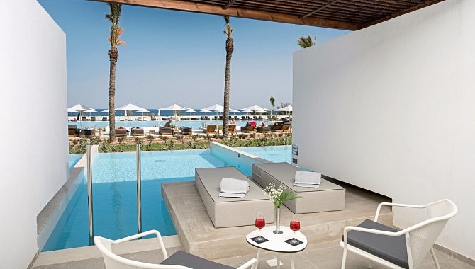 Suite Meerblick Privatpool: 46-50 qm, Meerblick, separater Wohnraum, 1 Bad, Dusche, WC, Bademantel, Badeslipper, Haartrockner, Kosmetikspiegel, Klimaanlage, individuell regulierbar, Safe, 1 TV (Sat-TV, Flachbildschirm), Telefon, WLAN, Espressomaschine, Kaffee/Tee, Kühlschrank, Terrasse, Privatpool
