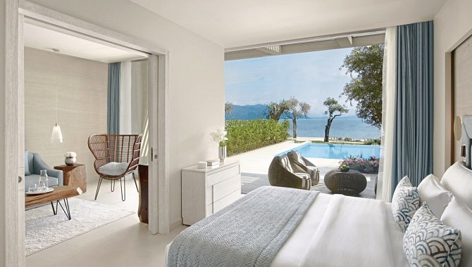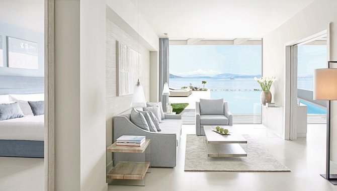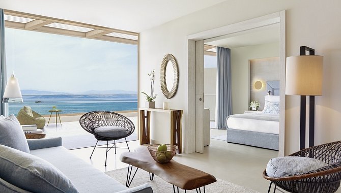 46-50 qm, Suite, Meerblick, 1 separates Schlafzimmer, separater Wohnraum, Dusche, Bademantel, Badeslipper, Haartrockner, Klimaanlage, Minibar, Auffüllung regelmäßig, Safe, TV (Sat-TV), DVD-Player, Kaffee/Tee, Terrasse (möbliert), direkter Poolzugang, direkter Strandzugang, Privatpool