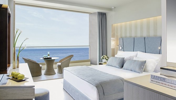 31-35 qm, Juniorsuite, Hauptgebäude, Meerblick, kombinierter Wohn-/Schlafraum, Dusche, Bademantel, Badeslipper, Haartrockner, Klimaanlage, Heizung, Minibar, Auffüllung regelmäßig, Safe, TV (Sat-TV, Flachbildschirm), DVD-Player, WLAN, Kaffee/Tee, Balkon (möbliert)