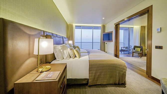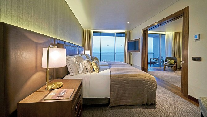 Suite: 51-60 qm, Meerblick (direkt), kombinierter Wohn-/Schlafraum, separates Schlafzimmer, Twinbett, Dusche, Bademantel, Badeslipper, Haartrockner, Kosmetikspiegel, Klimaanlage, Heizung, Minibar, Auffüllung regelmäßig, Softdrinks, Wasser, Safe, 2 TVs (Smart-TV), Telefon, WLAN, Wasserkocher, Kaffeemaschine, Balkon (möbliert), Kopfkissen-Menü, bei Ankunft im Zimmer Obst, Wein