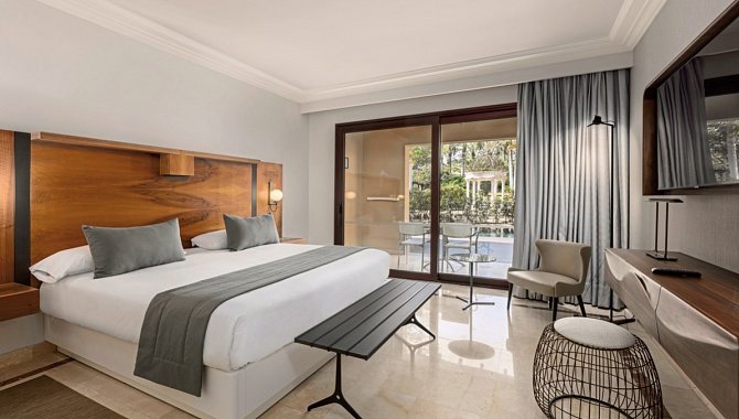 Doppelzimmer Pool- oder Gartenblick (DZG/DAG): 31-35 qm, Gartenblick, Poolblick (zum Teil), renoviert (2020), Sitzecke, Doppelbett, Dusche, Badewanne, WC, Bademantel, Haartrockner, Kosmetikspiegel, Fliesen, Klimaanlage, zentral gesteuert, Minibar kostenpflichtig, Safe (kostenpflichtig), TV (Sat-TV, Flachbildschirm), Telefon, Balkon oder Terrasse (möbliert)