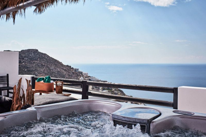 - Majestic Retreat: geräumiger Wohnbereich, Designer-Badezimmer mit einer aus Stein gefertigten Badewanne, möblierter Balkon mit Panoramablick auf die Bucht von Elia, Außenjacuzzi oder Privatpool buchbar