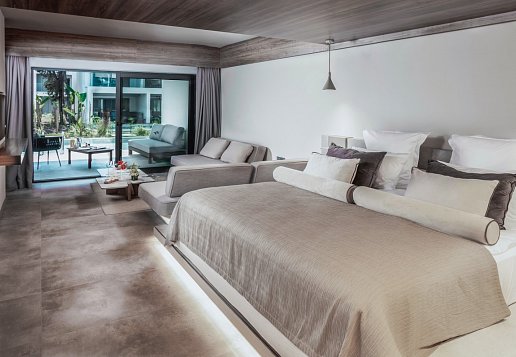 Familien-Suite-Meerblick-Poolzugang (FZB): Vierbett, Meerblick, Dusche, WC, Haartrockner, Klimaanlage kostenfrei, Minibar kostenfrei, Auffüllung regelmäßig, Softdrinks, Bier, Wasser, Safe (kostenfrei), TV (Sat-TV), Telefon, Wasserkocher, Terrasse