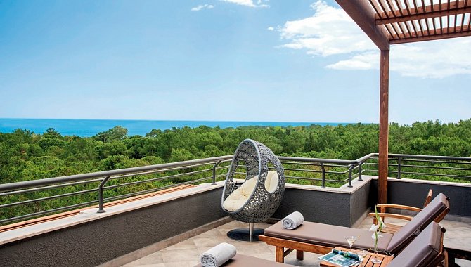 Meerblick-Junior-Suite (JSM): 46-50 qm, Juniorsuite, 1 Schlafzimmer, Hauptgebäude, Meerblick, Sitzecke, 1 Bad, Dusche, Badewanne, 1 WC, Bademantel (kostenfrei), Badeslipper, Haartrockner, Laminatboden, Klimaanlage kostenfrei, zentral gesteuert, Minibar kostenfrei, Safe (kostenfrei), 1 TV (Sat-TV, Flachbildschirm), Telefon, WLAN, kostenfrei, Wasserkocher, Kaffee/Tee, Terrasse
