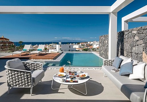 Deluxe Suite Two Bedroom ca. 110 qm: Wohnraum mit voll ausgestatteter Küche, 2 Schlafräume, 2 Bäder, 2 Terrassen (20 qm, 50 qm) Meer-/Berg- und Teide-Blick