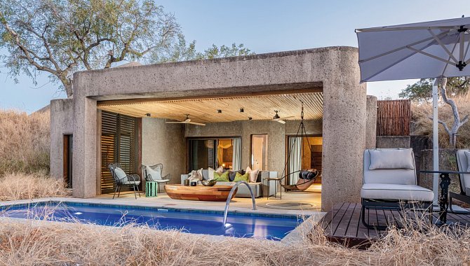 Earth Lodge Luxury Suite ( 13) ( WB2) ca. 143 qm inklusive Außenbereich, davon ca. 77 qm Wohnbereich: Komfortable Suite, EnSuite-Badezimmer mit Glasfront mit Blick in die Natur, Innen- sowie Außendusche und mit privatem Plunge-Pool.