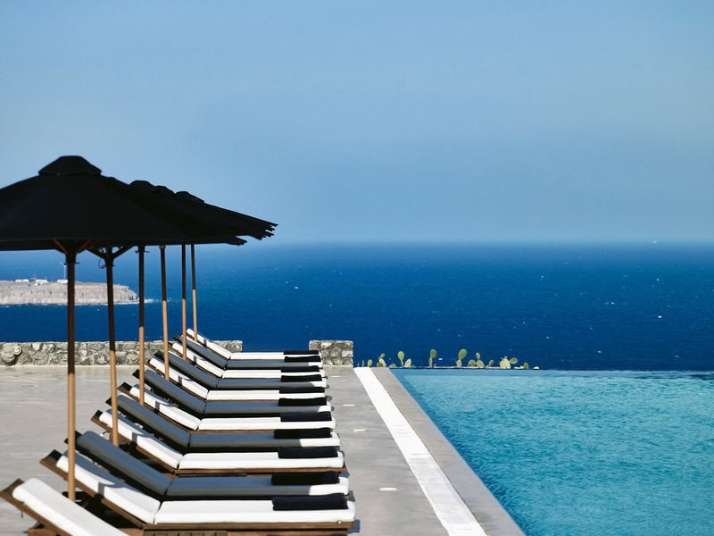 Suite, Meerblick, kombinierter Wohn-/Schlafraum, Sitzecke, Sofabett, Dusche, WC, Bademantel, Badeslipper, Haartrockner, Kosmetikspiegel, Klimaanlage, individuell regulierbar, Minibar kostenpflichtig, Safe, TV (Sat-TV, Flachbildschirm), WLAN, Kochnische, Essecke, Espressomaschine, Kaffee/Tee, Terrasse (möbliert), Privatpool, Kopfkissen-Menü