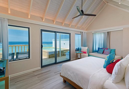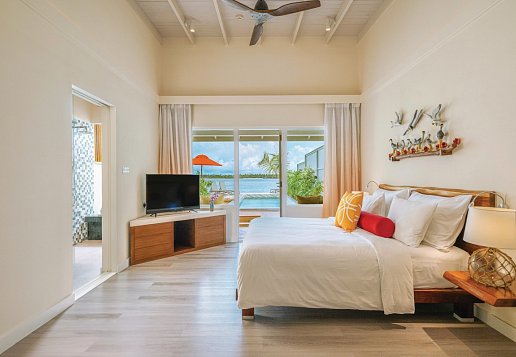 Sunrise Water Villa with Pool: 81-90 qm, Villa, freistehend, Sonnenaufgangsseite, Wasserbungalow (auf Stelzen über der Lagune), Meerblick, Ankleidebereich, Dusche, WC, Bademantel, Haartrockner, Klimaanlage, Ventilator, Minibar, Auffüllung täglich, Softdrinks, Mineralwasser, Safe, TV, WLAN, Wasserkocher, Kaffee/Tee, Terrasse (möbliert), direkter Meerzugang, Privatpool