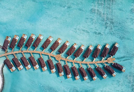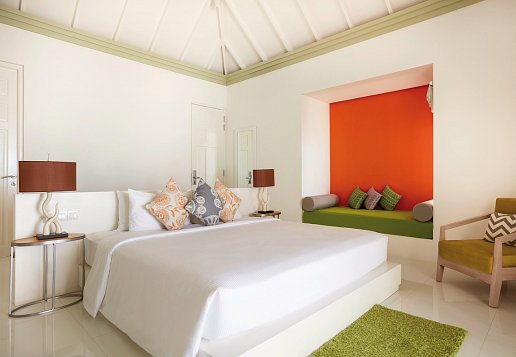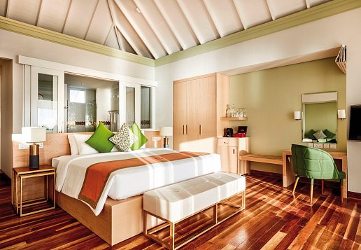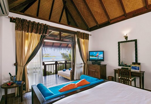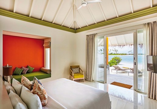Water Villa: 61-70 qm, Wasserbungalow (auf Stelzen über der Lagune), Meerblick, Dusche, Badewanne, WC, Haartrockner, Klimaanlage, Ventilator, Minibar kostenpflichtig, Safe, TV, WLAN, Wasserkocher, Kaffee/Tee, Terrasse (möbliert), direkter Meerzugang