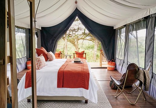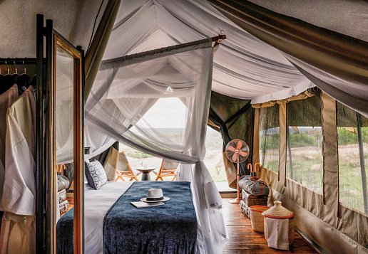 Das komfortable Safari-Camp beseht aus dem zentral gelegenen Hauptzelt mit angeschlossener Lounge, vor dem Gäste abends an der Feuerstelle sitzen können. Es kann an zwei Seiten geöffnet werden, um den Blick auf die Serengeti zu öffnen. Die Küche serviert neben frischer internationaler auch traditioneller tansanischer und sansibarischer Küche. Zehn klassische Safari-Zelte auf hölzernen Plattformen, mit privatem Deck und Badezimmer en suite mit authentischer Eimer-Dusche. Das Interieur kombiniert den Stil der Entdecker des 19. Jahrhunderts mit Mid-Century-Chic. Die Zelte sind elegant eingerichtet mit portablem Mobiliar, Schreibtisch, Safe, Tee- und Kaffee-Station, Internet-Zugang, Moskitonetz, Steckdose, Föhn, Gymnastik- und Yoga-Kits. Täglich sind 2 Pirschfahrten im offenen Geländewagen eingeschlossen.