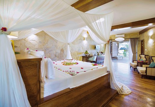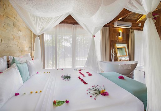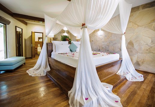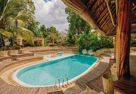Die 16 Bungalows und Villen bieten viel Privatsphäre und herrliche Ausblicke in den tropischen Garten und auf das Meer. Die Kombination von afrikanischem Holz und Stein mit traditionellem Strohdach schafft einen authentischen und modernen afrikanischen Stil. Ausgestattet mit Holzfussboden, Kingsize-Bett (2 x 2 m), Bad mit Badewanne und separater Dusche, Föhn und Bademantel, Telefon, Flachbild-Satelliten-TV, WLAN (ohne Gebühr), Minibar (ohne Gebühr), Nespresso-Maschine, Tee-/Kaffeezubereiter, Safe, Klimaanlage und privater möblierter Terrasse.